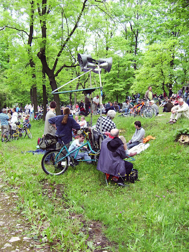 Rower może mieć różne zastosowanie-tu jest jest pojazdem z nagłośnieniem.Nadaje rytm i ton pielgrzymom