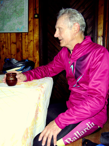 Rower na pierwszym planie to cudo -według właściciela.Zrobił wolnym słuchaczom istny show!Najpierw wykręcił przednie koło,miało 600 gram wagi,tyle ma moja opona.Reszta też super ,zachwalał pewną firmę .Ale i ja i Roman zastanawialiśmy się czemu to cudo z wagą ponizej 10 kg i taka kosmiczna technologią nie jest brane pod uwagę przez kluby na wyścigi